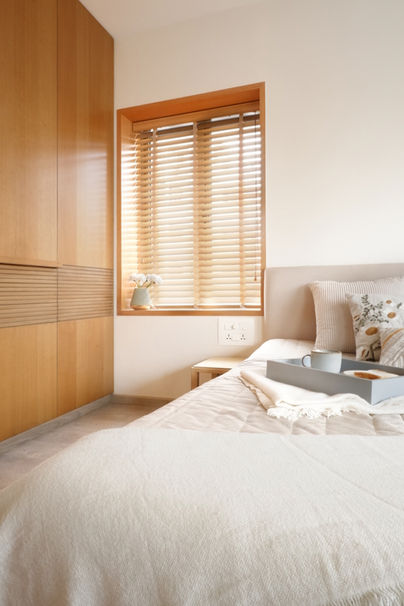 A cozy and warm bedroom for a young couple trying to create a space to unwind and relax. The curtain and venetian blinds add drama to the beautiful light entering the room. The space is inviting and perfect for leisure.